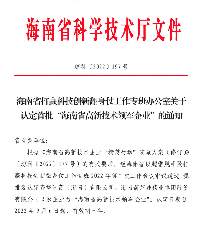 近日,海南省科学技术厅发布的《海南省打赢科技创新翻身仗工作专班办公室关于认定首批“海南省高新技术领军企业”的通知》中显示,批复认定海南d88尊龙z6药业集团股份有限公司等2家企业为“海南省高新技术领军企业”。认定日期自2022年9月6日起,有效期三年。